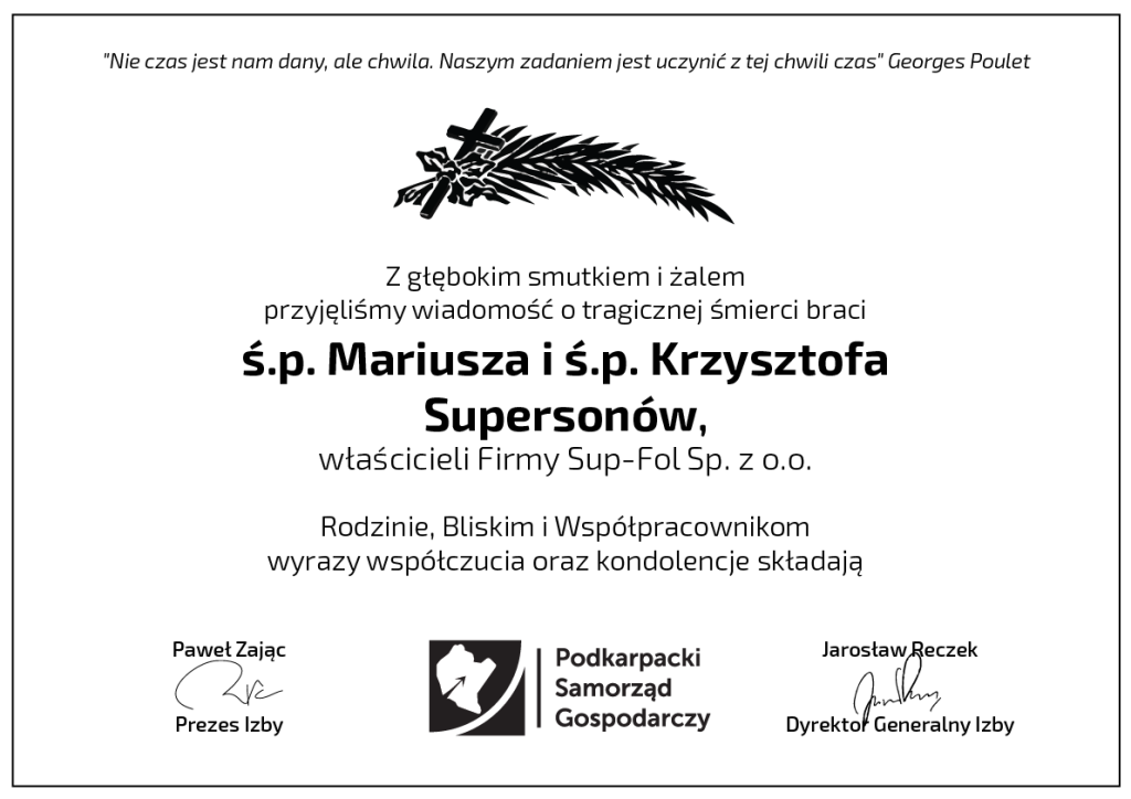 Z ogromnym smutkiem jako Podkarpacki Samorząd Gospodarczy przyjęliśmy wiadomość o tragicznej śmierci Mariusza i Krzysztofa Supersonów – właścicieli firmy Sup-Fol Sp. z o.o.